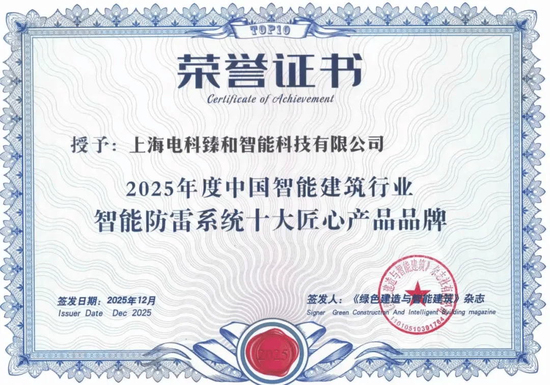 YYVIP易游·(中国有限公司)官方网站作为智能建筑行业知名企业,电科臻和于2025年连续第九年荣获“中国智能建筑行业十大匠心产品品牌企业”称号。电科臻和这份荣誉,既是行业对其长期坚守的认可,也是匠心与创新共同作用的结果。自2004年成立以来,电科臻和作为雷电防护领域的高新技术企业,用二十余年积淀筑牢根基,以九年连冠树立行业标杆。